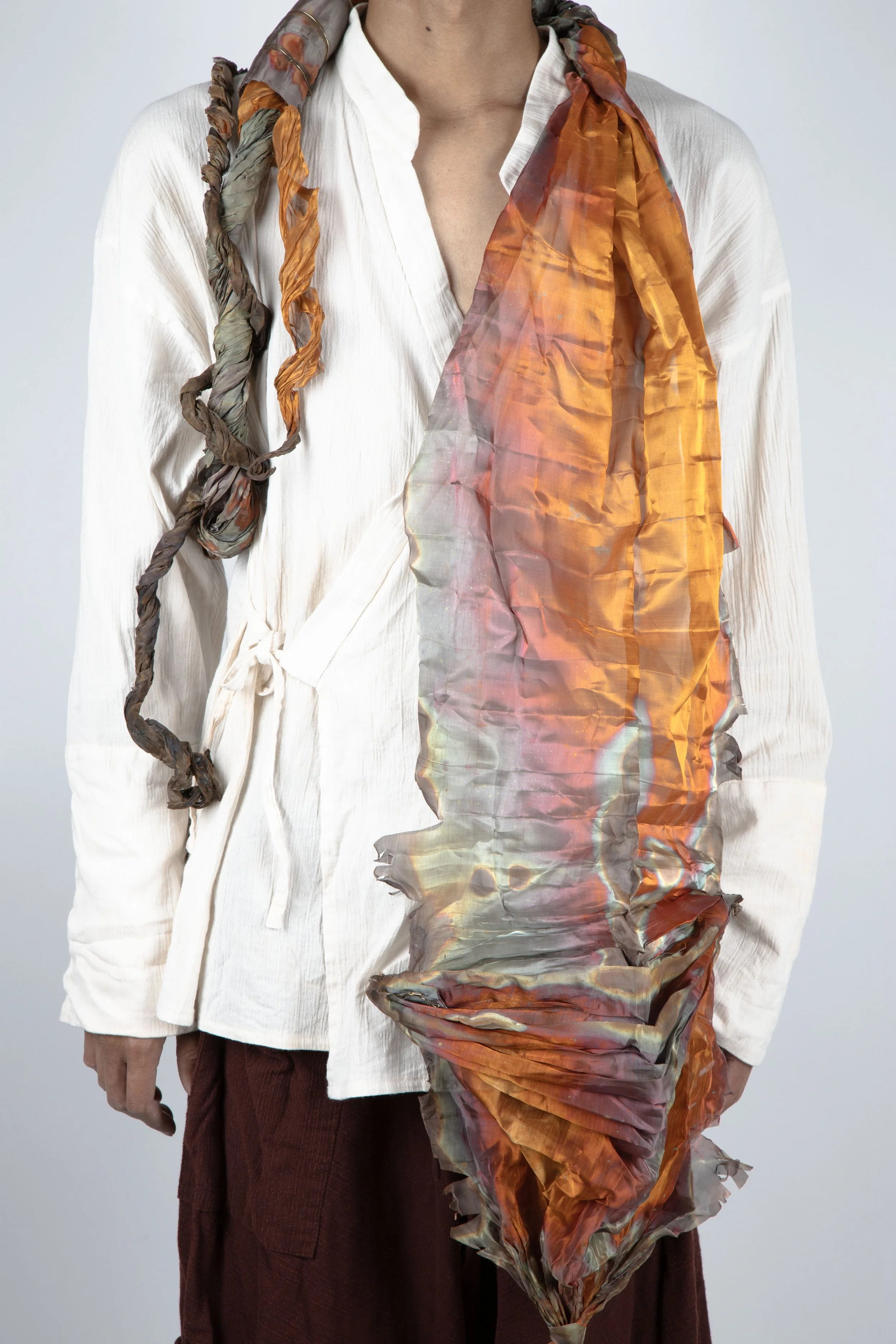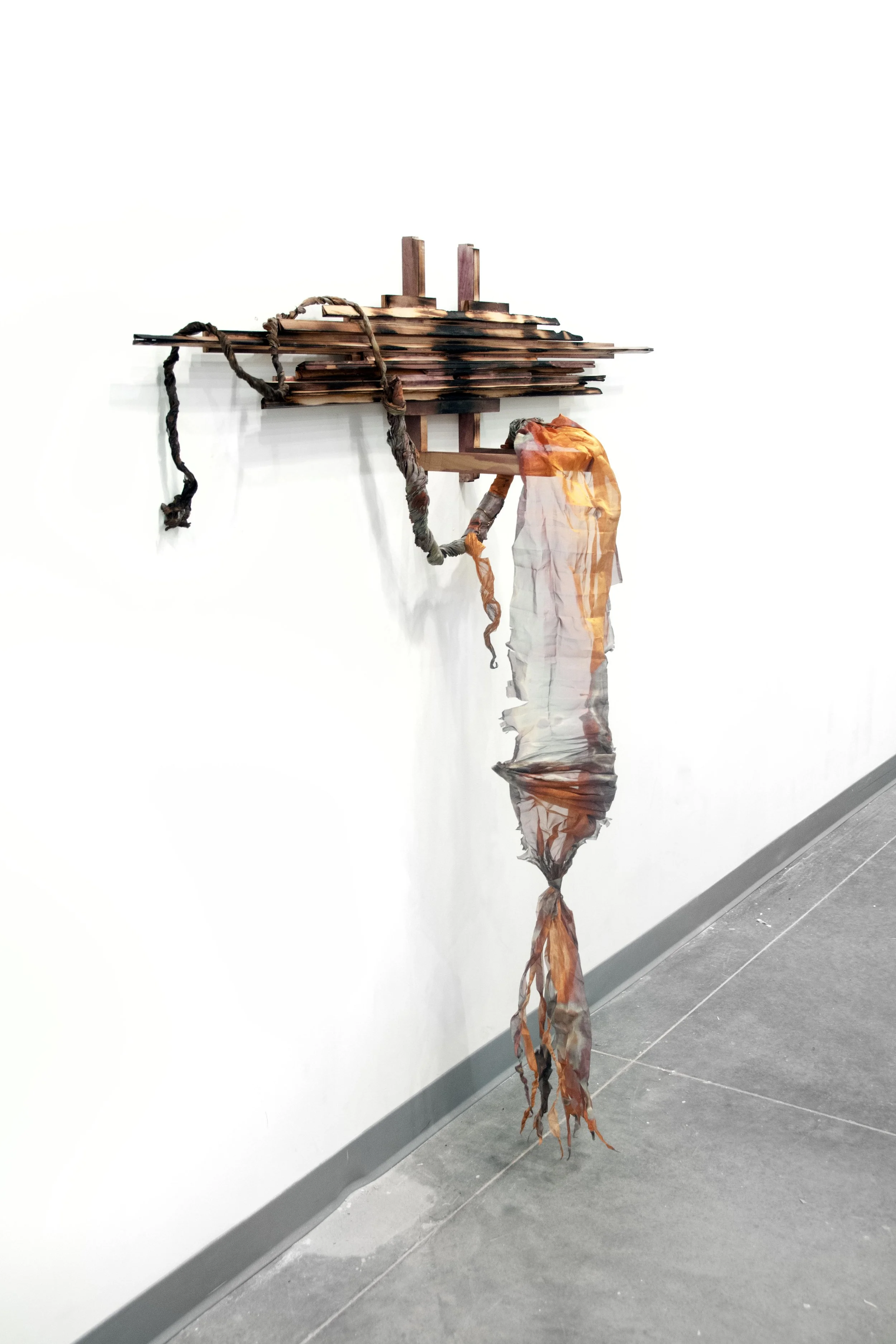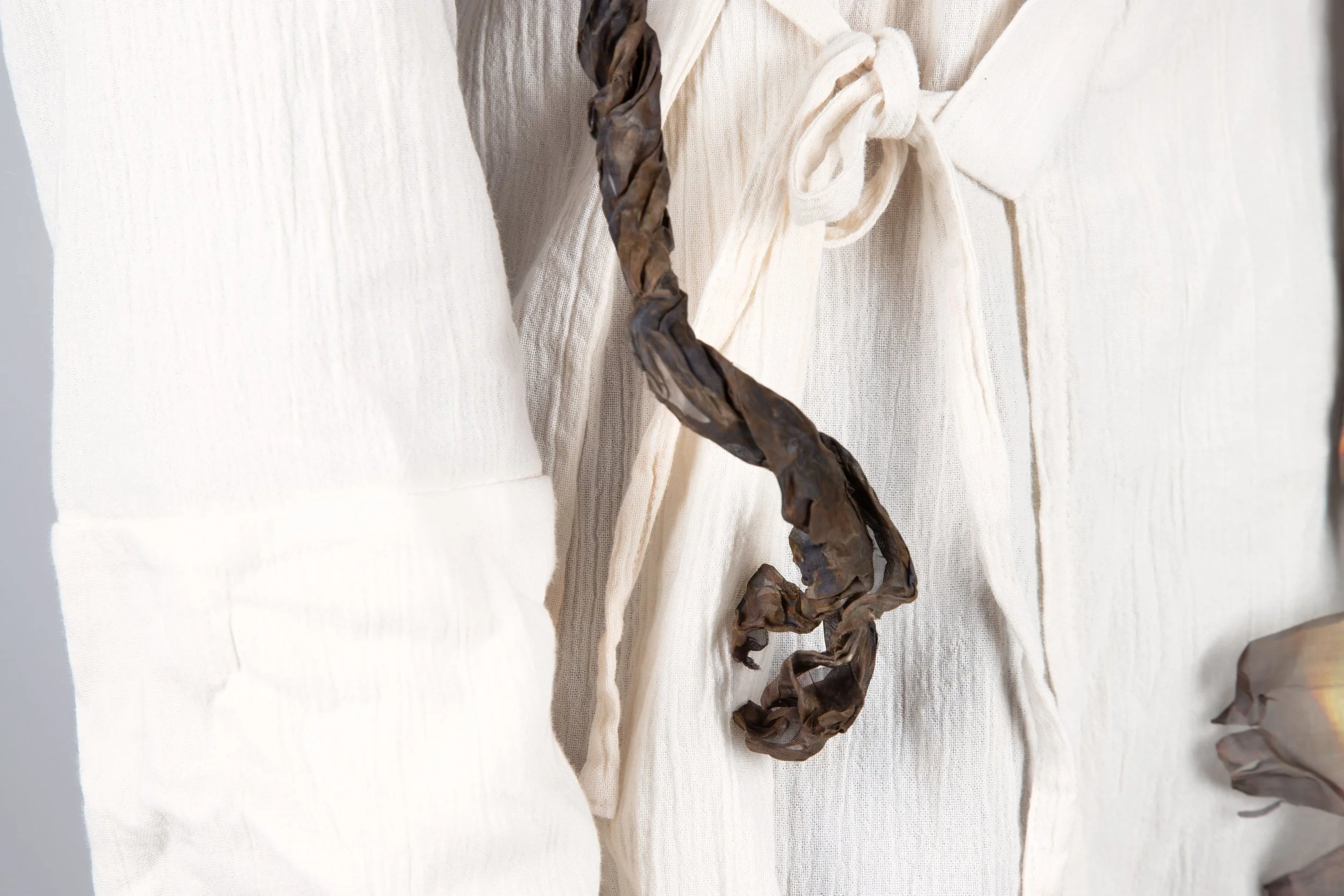 This work unfolds within a larger speculative narrative imagining nomadic Thai communities surviving in a future shaped by ecological collapse. In this imagined world, remnants of industrial infrastructure are adapted into forms of cultural wear that safeguard memory and belonging. The sabai, a shawl-like garment traditionally worn by Thai men and women, becomes a symbolic form that speaks to spiritual tethering and cultural dislocation. The sculptures transition from textile-like expanses into corded, twisted shapes, evoking a sense of severance and inheritance, grounding and unraveling. These dualities reflect the complexities of diasporic identity, where rootedness and groundlessness often coexist.