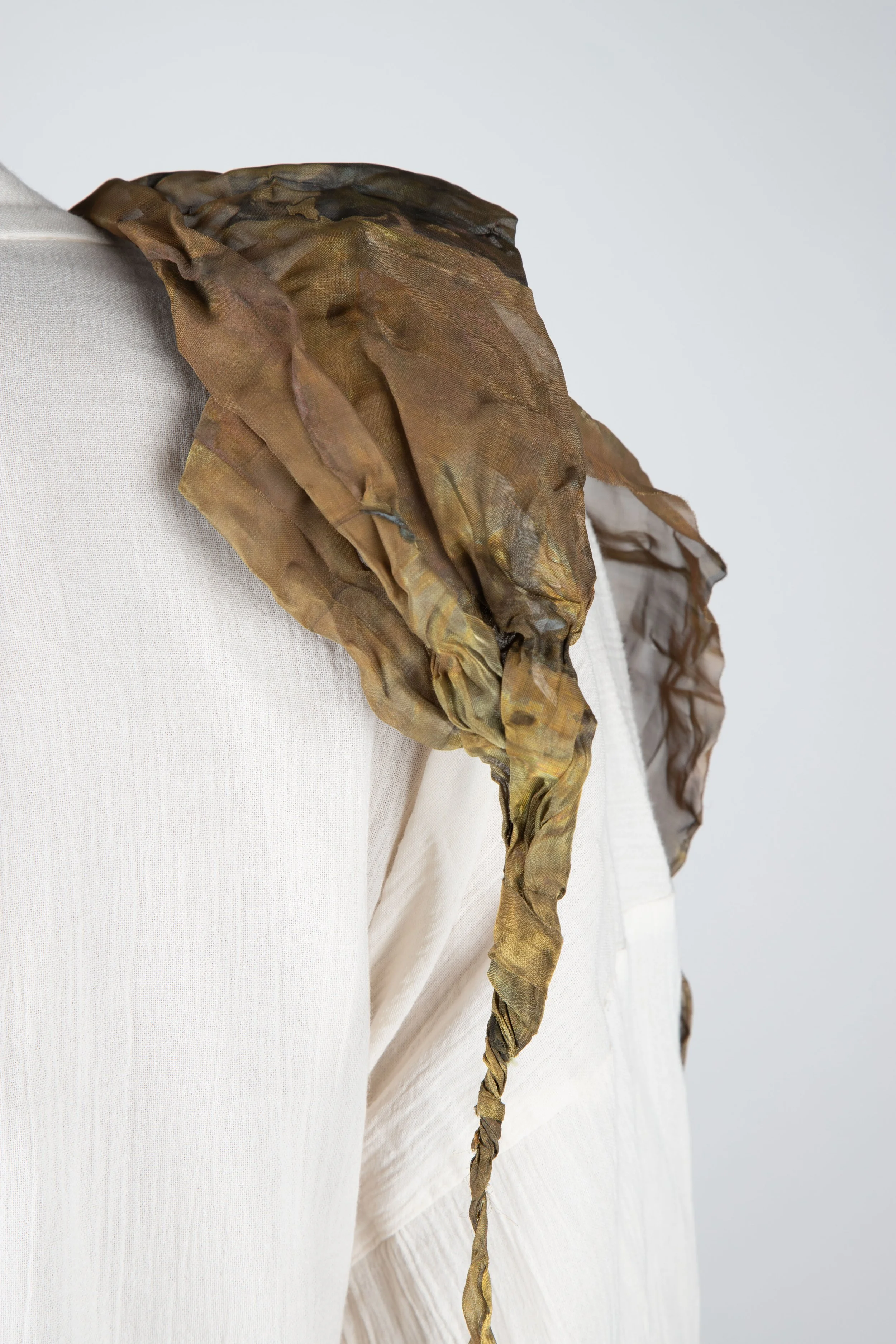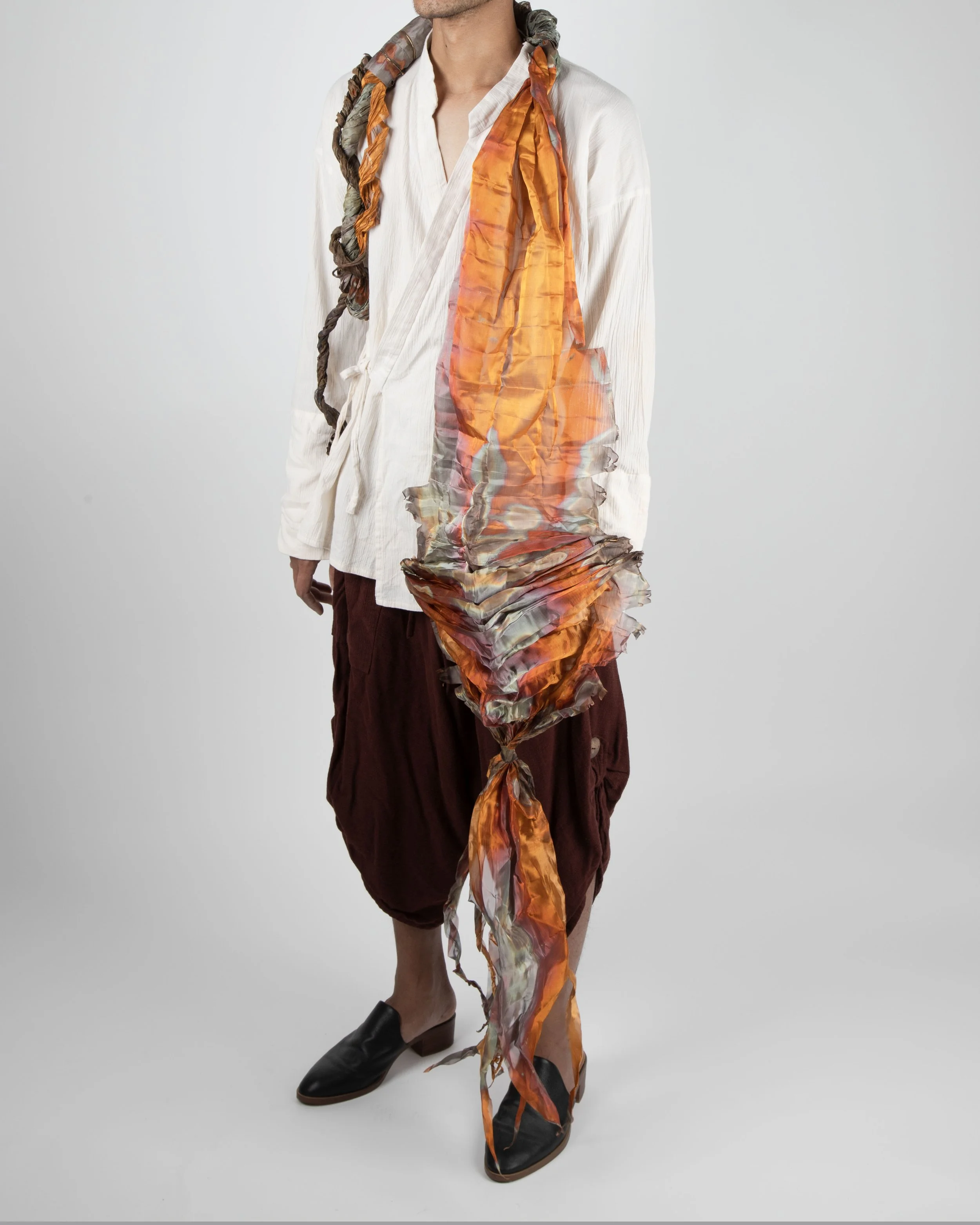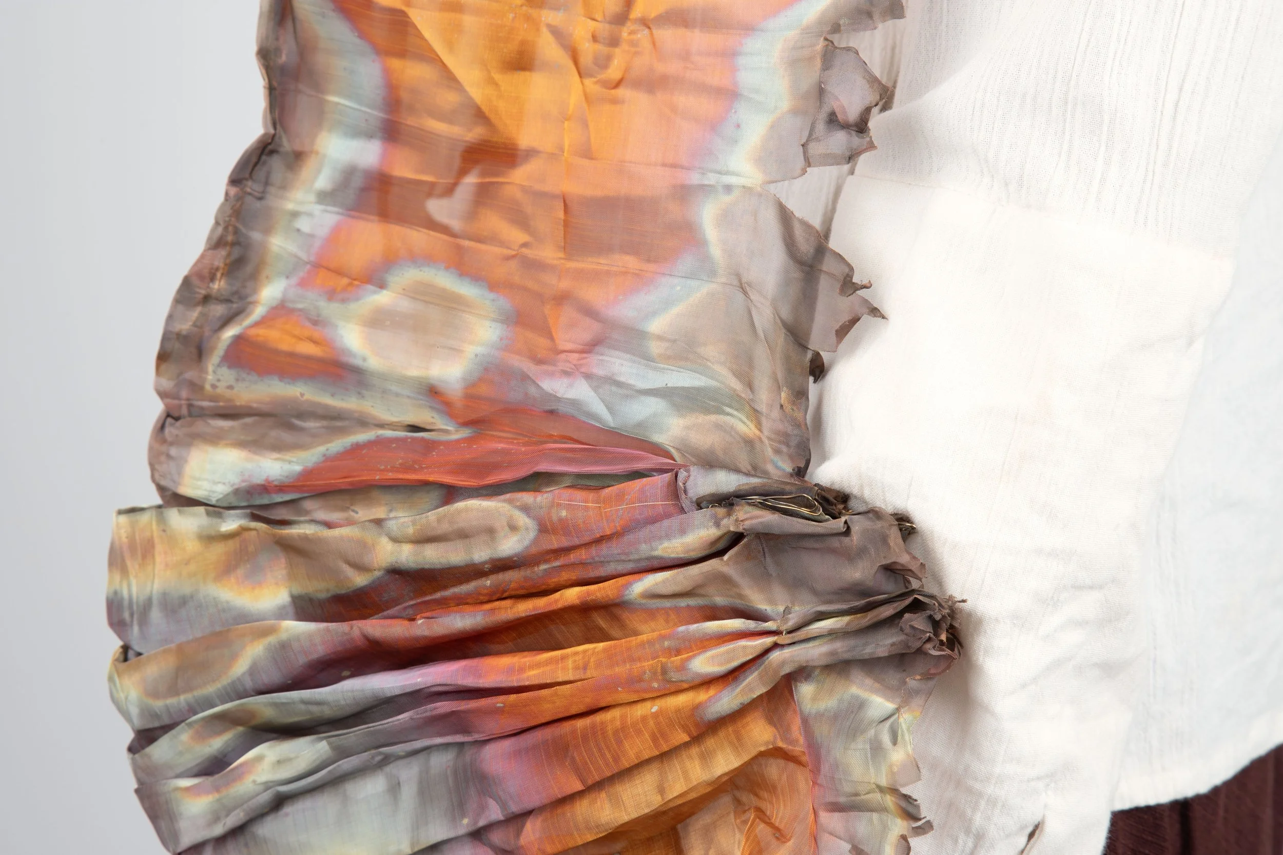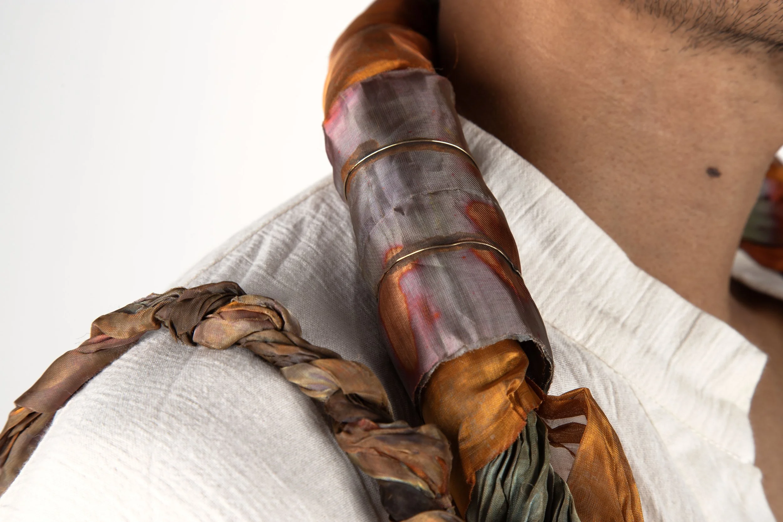 Sabai (Severed) is a body of wearable sculptures made from fine metal meshes in brass, copper, and stainless steel. Typically used for filtration, shielding, and containment, these industrial materials are reimagined through traditional and experimental patination processes. Inspired by Southeast Asian dyeing practices such as Thai mudmee tie-dye and smocking, I manipulate the mesh by pleating, binding, and stamping it with wooden tools before exposing it to chemical treatments through fuming, immersion, and direct application. These resist-based methods leave textile-like impressions of compression, folding, and release, resulting in surfaces that resemble the wear and softness of silk cloth aged by time and care.